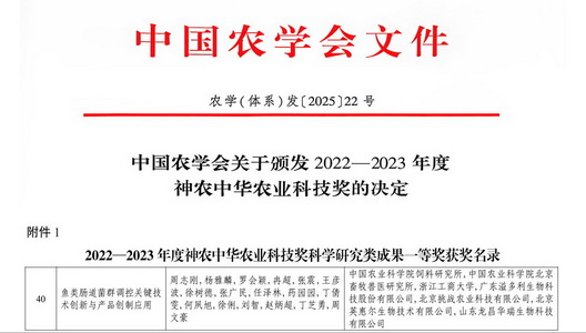“鱼类肠道菌群调控关键技术创新与产品创制应用”荣获神农中华农业科技奖科学研究类成果奖一等奖